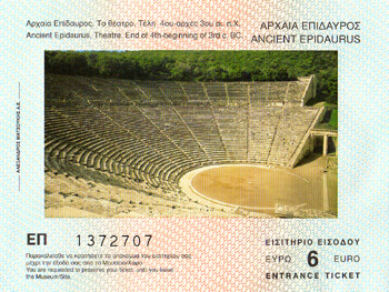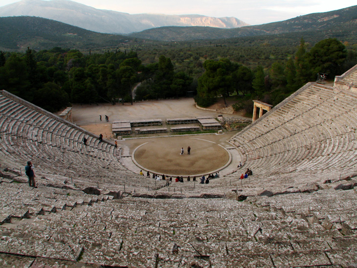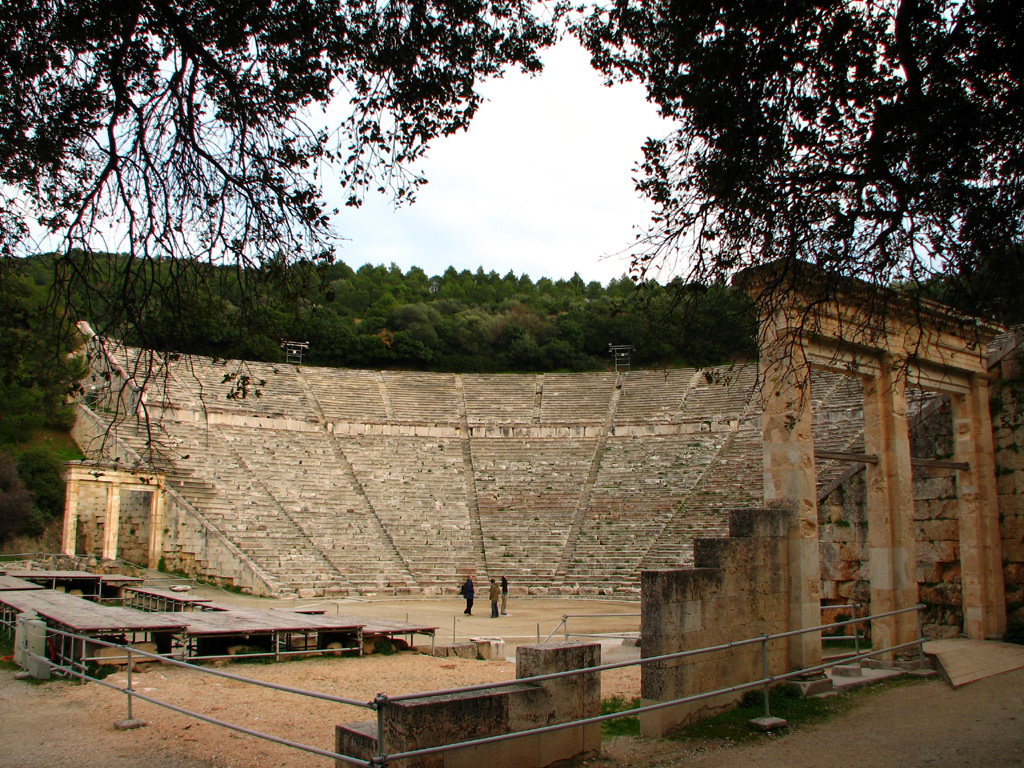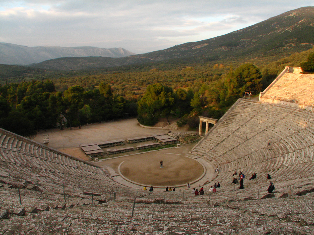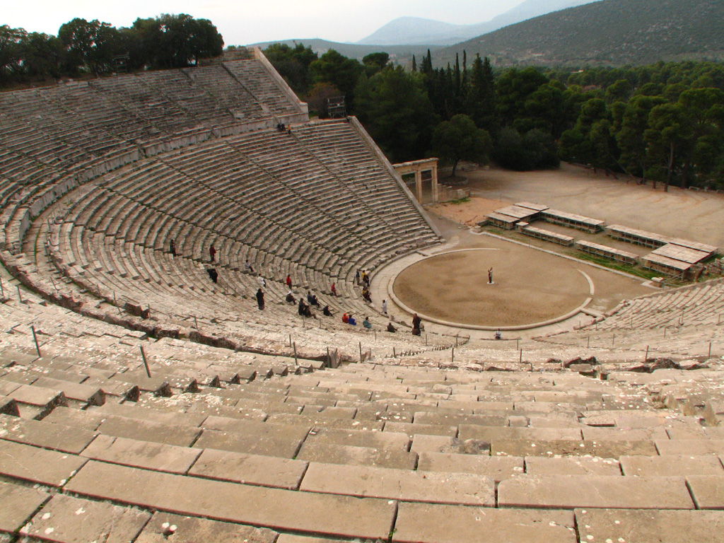 エピダウロス遺跡・円形劇場に到着♪この円形劇場は、紀元前4世紀に建てられ、音響効果に優れた劇場として有名な遺跡です。当時の姿をほぼ完璧に残している数少ない劇場のひとつで、55段の観客席、1万4000人を収容する事ができます。