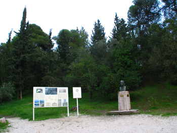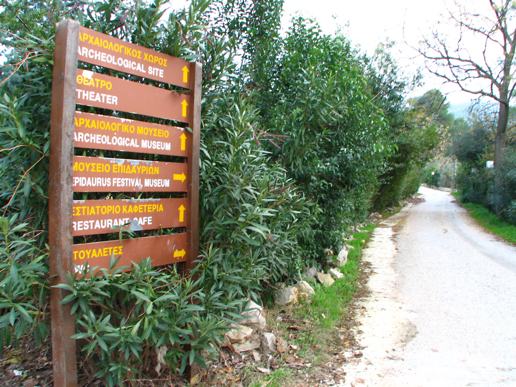 15時50分頃、エピダウロス遺跡へと到着。バスから降りて、細道をまっすぐに進みます。途中、エピダウロス遺跡への標識や案内板が置いてありました。この辺りから疲れてきて、写真の撮り方もだんだん適当に(笑)。近づくのが面倒なので遠くから撮っています(^^;)。