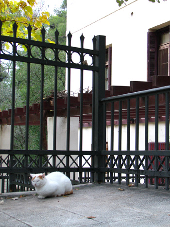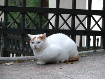 そろそろ円形劇場をあとにします。来た道と同じ道を通ってバスのところまで戻ります。その途中で、毛ヅヤのいい綺麗な白猫ちゃんに出会います。とてもかわいいです♪ちょっとふっくらしている感じ。いいもの食べてそうです。