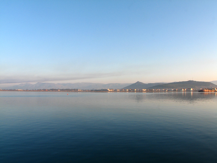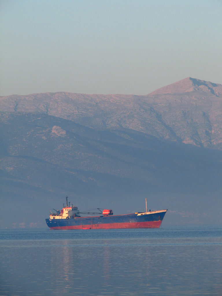 アルゴリス湾に浮かぶ船を望遠で切り撮って見ました。哀愁漂う感じですね。バックにある山がまた迫力大!