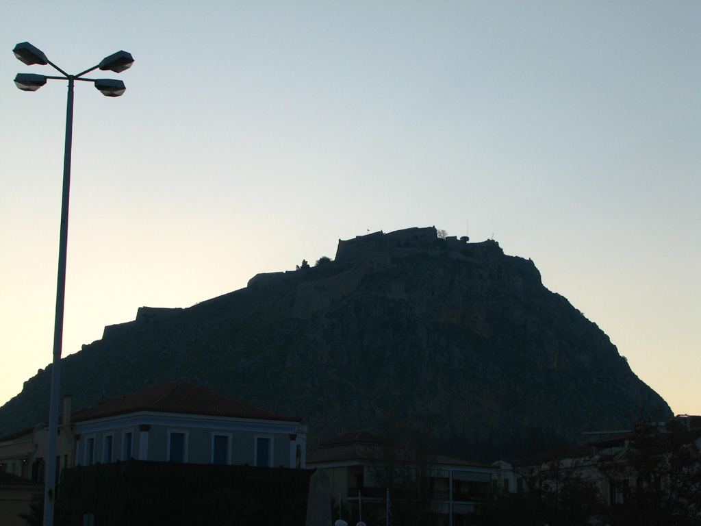 港町の反対側を見ると、山の上にパラミディ砦が見えます。逆光撮影だったので、ややシルエット気味になってしまいましたが、山の上の方に確かに砦らしきものを確認する事ができました。