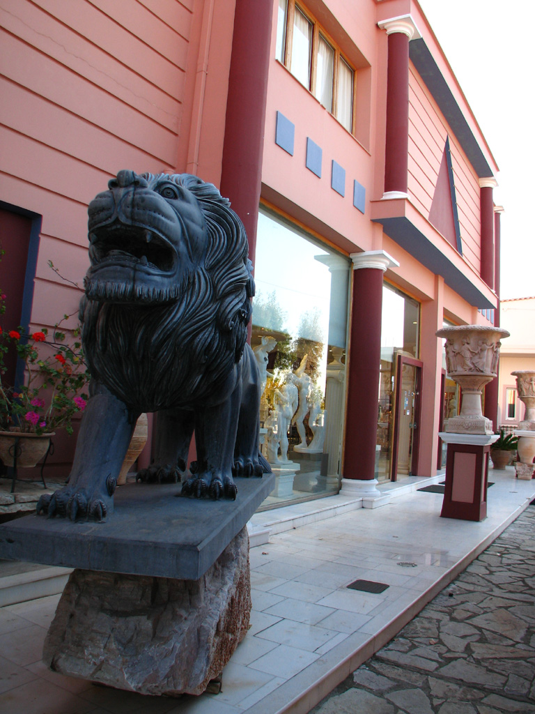 この店では彫刻や陶器などがたくさん置いてありました。店内を一通り見た後で、店の外にでて辺りを散策します。バスで隠れて見えないけど、バスの裏には立派なライオンの彫刻が…。勿論、このライオンちゃんと2ショット撮影しちゃいました♪