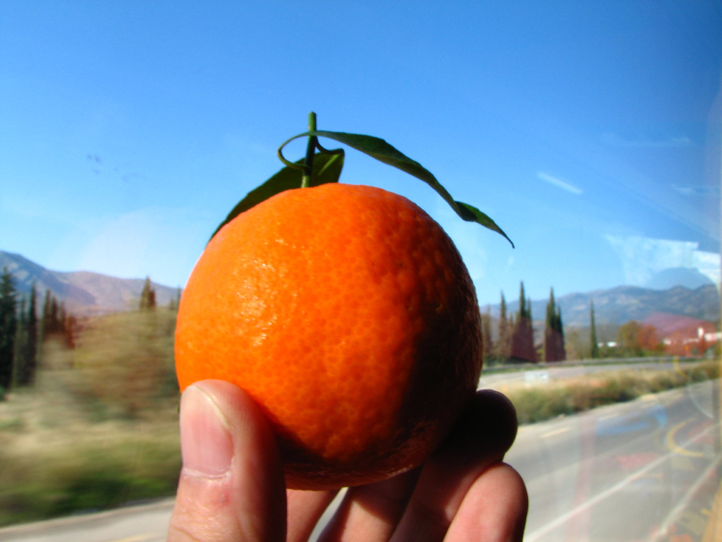 せっかくもらった蜜柑ちゃんなのでバスの車窓からギリシャの風景に溶け込ませて撮影してみました。ギリシャだとわかるように糸杉も。