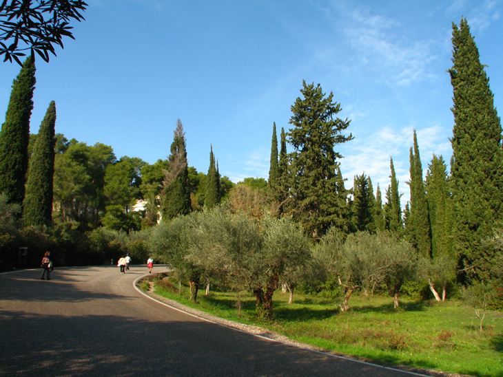 まず、オリンピア遺跡を出て、バスの停車場まで向かいます。その途中で、たくさんの糸杉を発見!綺麗~。ヨーロッパって感じだね♪糸杉は絵になりますなぁ。オリーブの木も写っています。