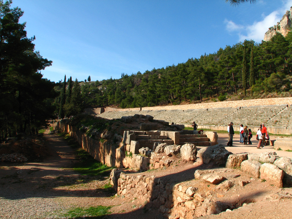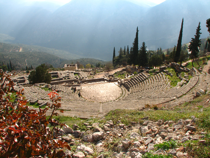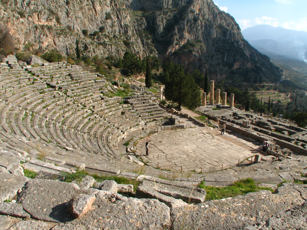 アポロン神殿のすぐ上には、紀元前4世紀ごろに建築された劇場があります。5000人を収容する客席をもち、現在残っているのは、紀元前2世紀に再建されたものです。いつの時代にも娯楽は欠かせないものだったんですね。はい、チーズ♪