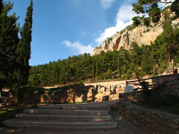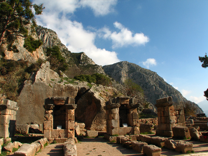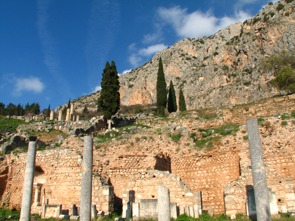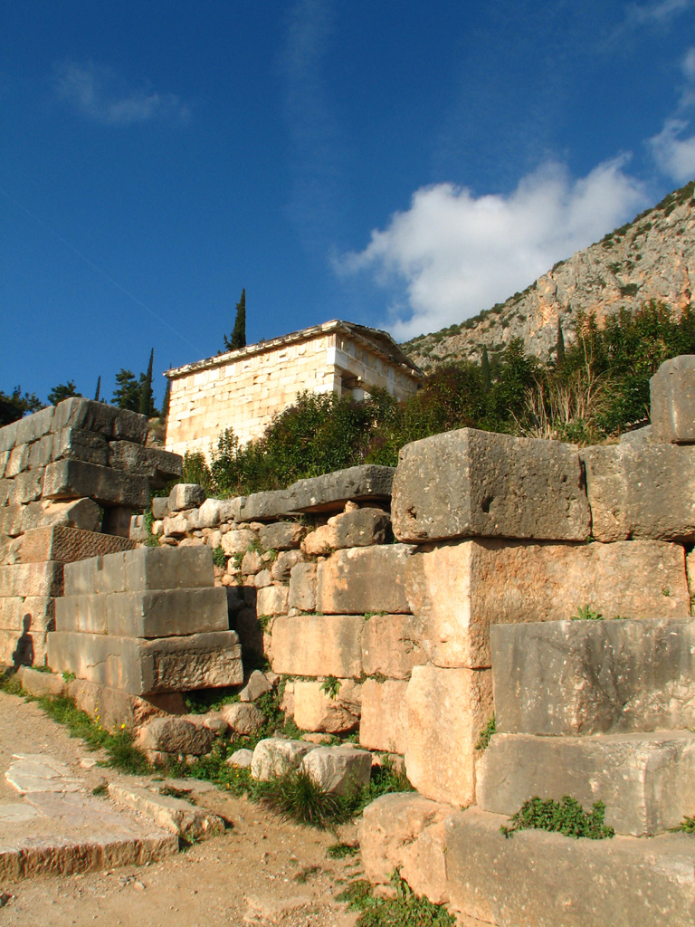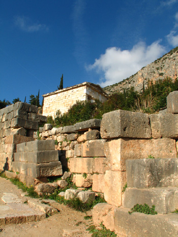 階段を登ってまず最初に見えてくるのは、スパルタ人の記念館。紀元前405年のエゴスポタミの海戦で、アテネを破ったスパルタが奉納したもので将軍や神々のブロンズ像が37体飾られていたそうです。