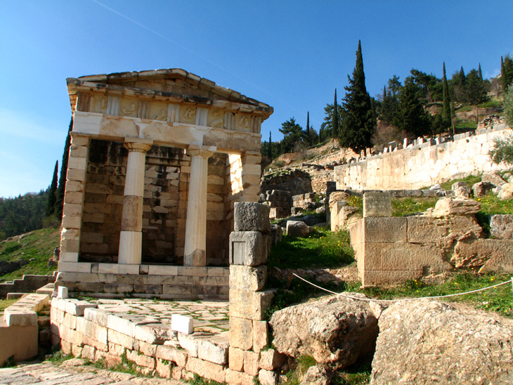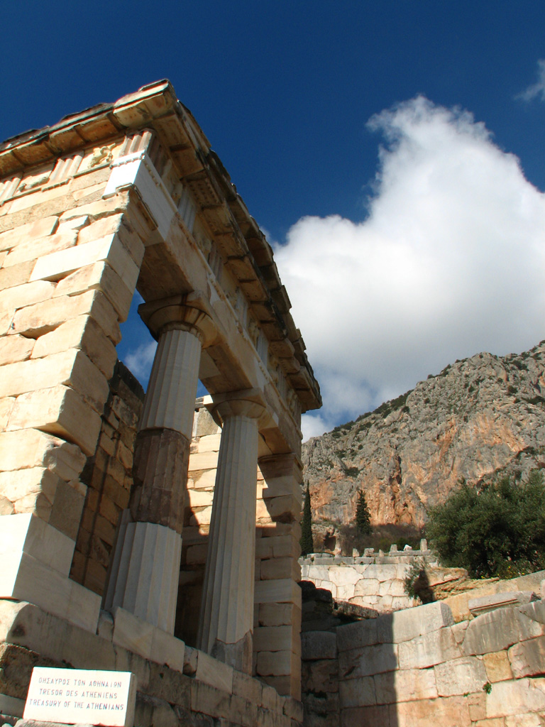 アテネ人の宝庫は、アテネがマラトンの戦いに勝利した記念に建てた宝庫です。入り口に2本の柱をもつドリス式建築物で、ほぼ完全な姿に復元されました。ここも人気スポットで撮影する人が後を絶ちません。人がいなくなるまで気長に待っていた暇な自分…(笑)。