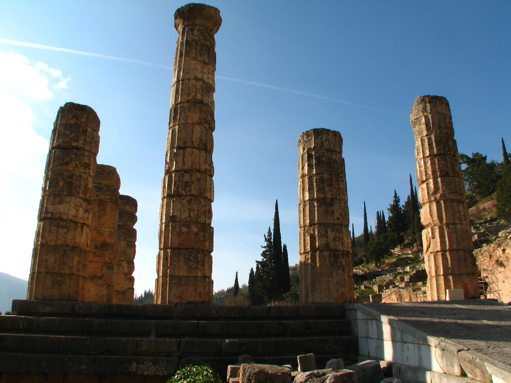 アポロンの神殿に到着。アポロン神殿は、幅23m、長さ60mのドリス式建築で正面に6本、側面に16本の柱をもっていました。現在では、6本の柱が復元されています。