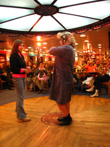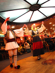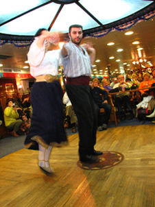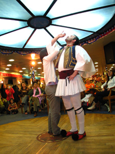 船内に入るとすぐに、最後のイベントともいえるギリシャダンスショーが行われました。会場に行ったときは既にほとんどの席が埋まっており、たまたま空いていた席に座ったらそれがなんと1番前で、ラッキー!と思ったのは最初だけでした(笑)。
